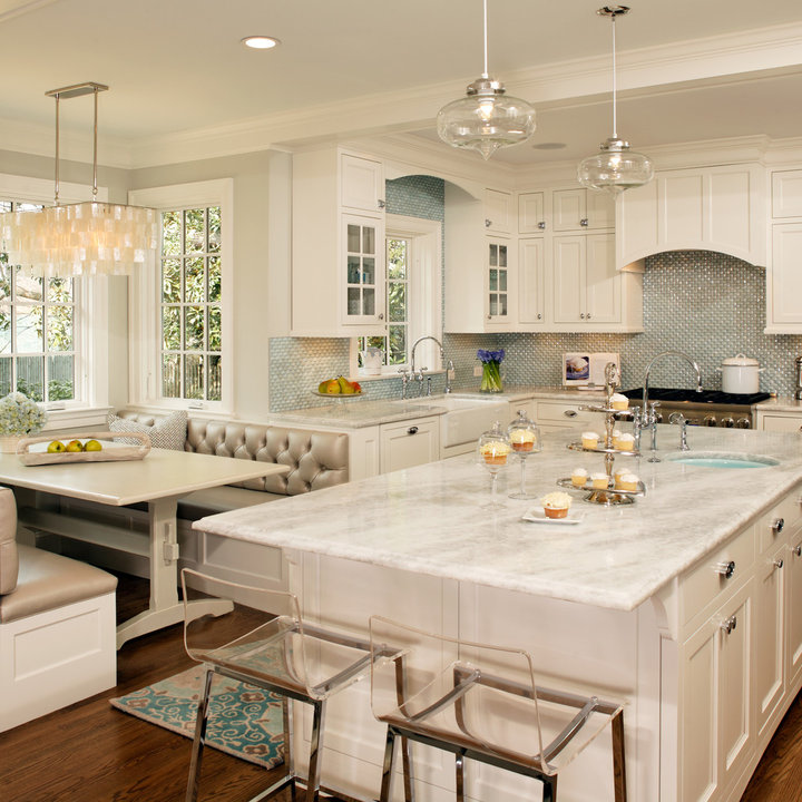EMILY FOLLOWILLФартук — когда для столешницы и фартука используется один и тот же стиль плиты — создается гладкий вид, который облегчает очистку от кухонных брызг. Профессиональные дизайнеры используют этот стиль, в том числе дизайнер Мелани Милнер, которая выбрала кварцит Cielo для этого европейского поместья в Джорджии. Усильте ощущение простора и сплоченности с помощью небольшой полки-витрины из того же материала.