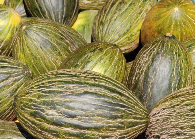 Дыни Валенсии имеют удлиненно-овальную форму с толстой темно-зеленой кожурой и бледно-белой сочной мякотью.