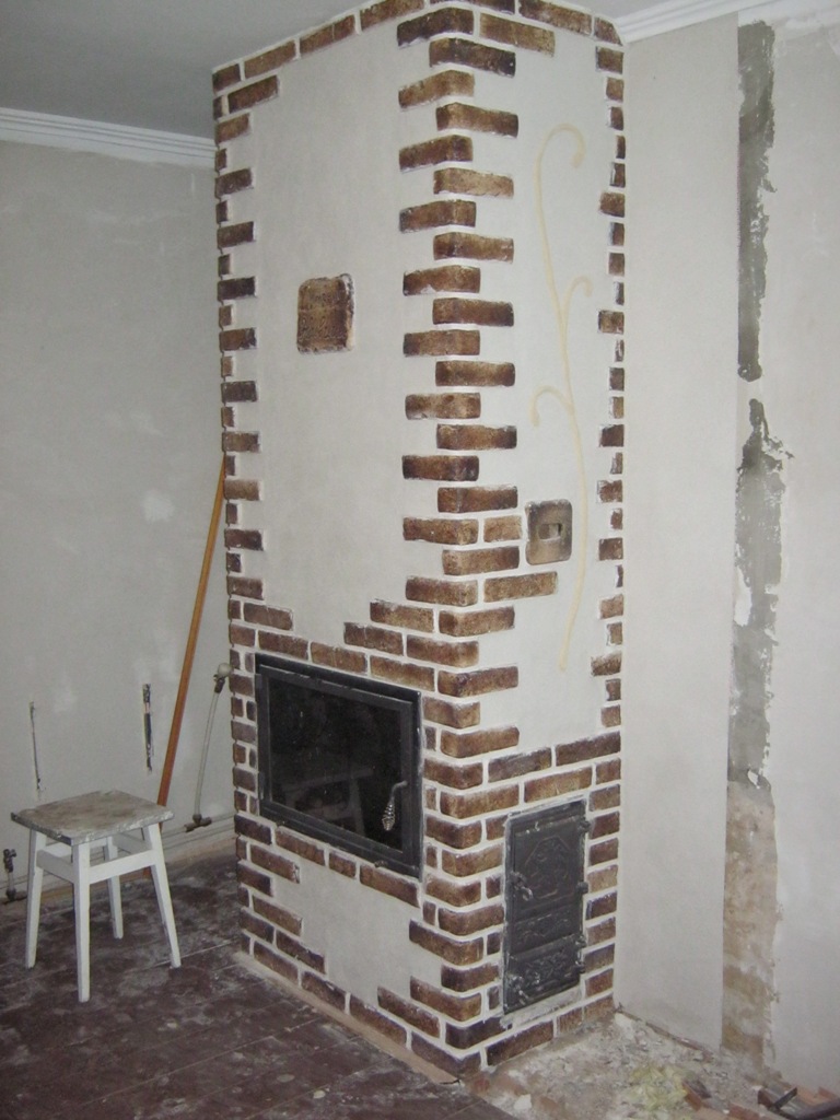 Этот способ отличается от всех остальных тем, что отделочный кирпич может закрепляться уже на этапе кладки отопительной конструкции. Но и когда печь уже давно используется, оформить этим материалом ее поверхность допускается.