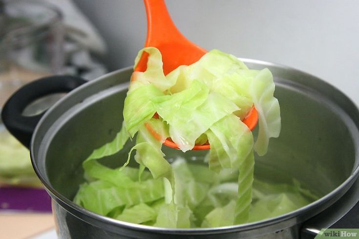 - Когда вода закипит, добавьте около 1 столовой ложки соли и белого винного уксуса.Осторожно поместите капусту в воду отверстием вниз. Готовьте примерно 10-15 минут, затем включите и начните удалять листья. Вы будете делать это с помощью двух вилок, царапая и потягивая края отверстия. Если они не отрываются легко, продолжайте готовить капусту, пока она не начнет сниматься. Будьте осторожны, чтобы не обжечь руки кипятком.