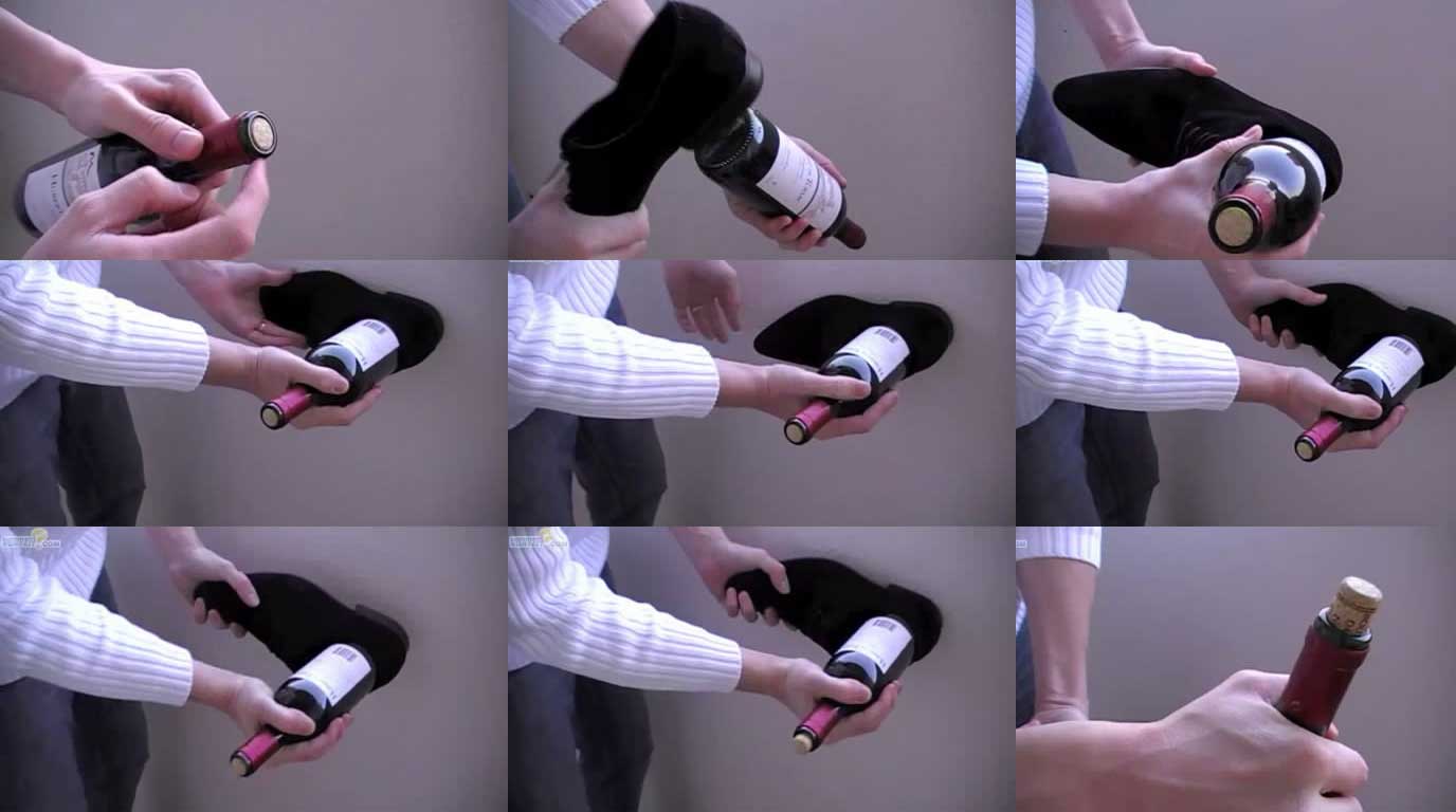 Сначала вы удаляете защитную пленку, покрывающую верхнюю часть бутылки (известную как «капсула»). Затем вы помещаете нижнюю часть бутылки внутрь обуви, чтобы защитить стекло, а затем ударяете подошвой обуви о стену несколько раз, пока пробка не выйдет из бутылки.Выглядит так просто!