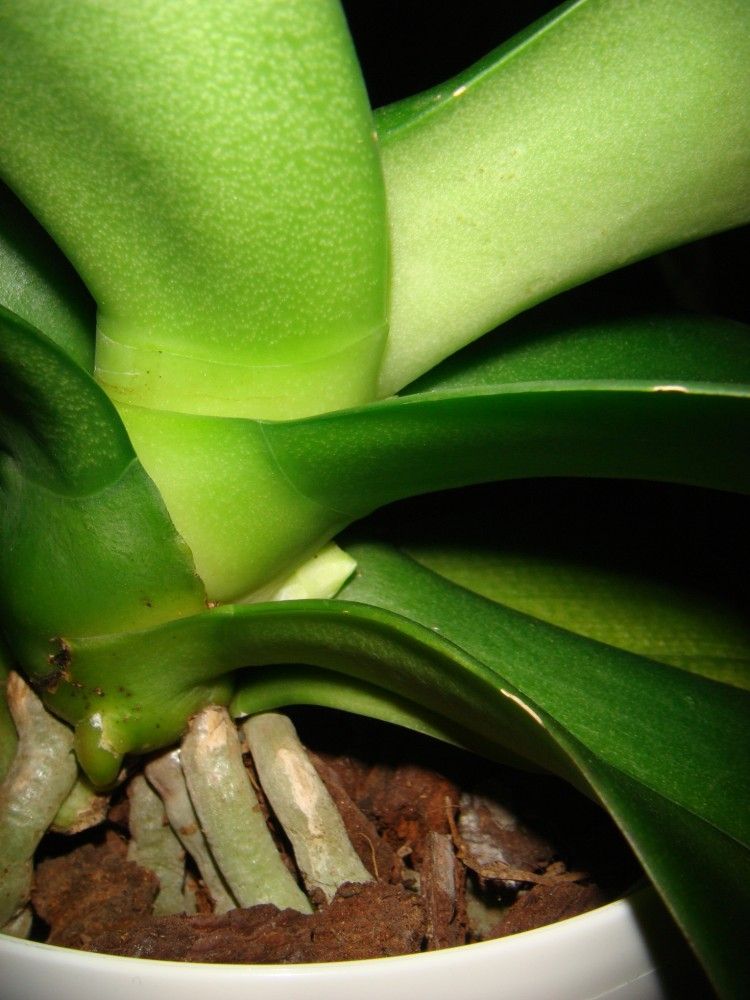 Цветочный побег всегда появляется из пазухи листовой пластины. В том месте, где лист прикрепляется к стволу. Корни могут быть расположены по всему периметру корневой шейки орхидеи.