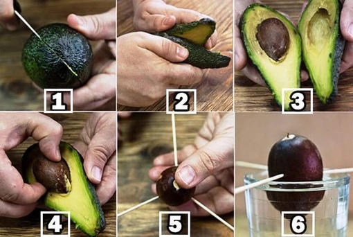 Любители комнатных растений используют еще один способ выращивания авокадо в горшке, который они считают более надежным. Возьмите три-четыре зубочистки, по центру косточки по периметру сделайте проколы и вставьте в них зубочистки на глубину 2-5 мм. Эту конструкцию помещают в стакан с отстоянной водой.