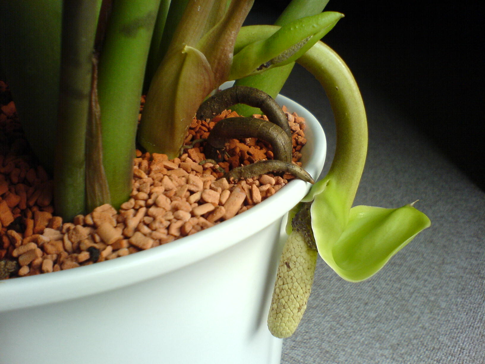 Зацвести в комнатных условиях может только хорошо развитое растение. У него на коротеньком цветоносе появляется соцветие-початок, который сверху укрыт верхушечным бледно-зеленым листом.