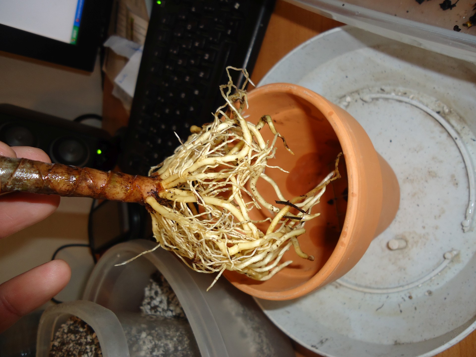 - После этого необходимо хорошо осмотреть все корни и обрезать пустые веточки тёмно-коричневого цвета внутри корневой системы.