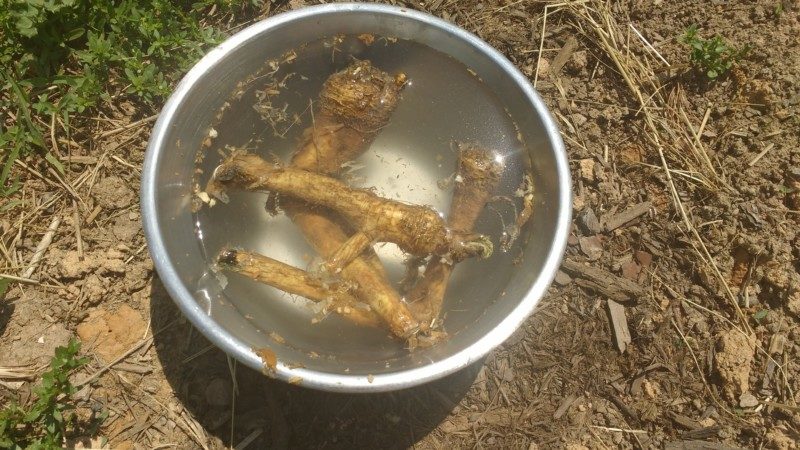 - После очистки засыпаю корень землёй, слегка утрамбовываю и поливаю.