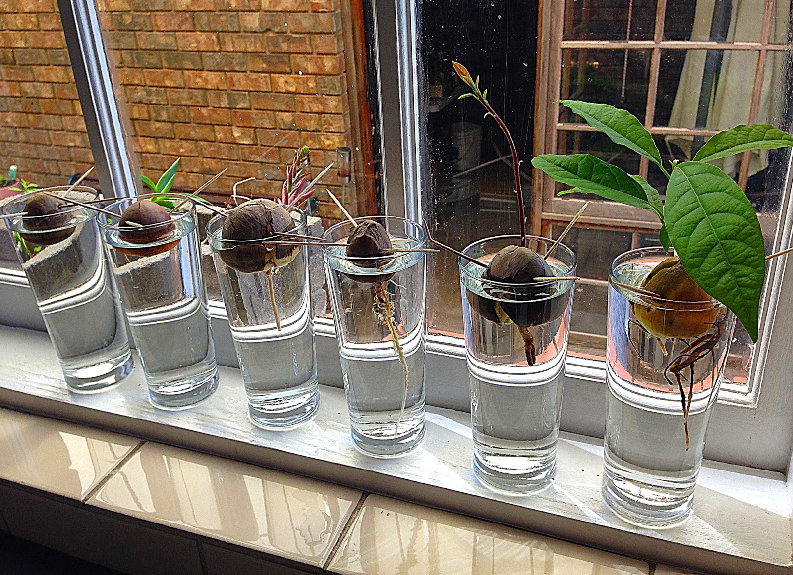 Поместите косточки авокадо в стаканы в месте, где они будут получать много солнца. Обязательно поддерживайте постоянный уровень воды. Следите за прорастанием косточек авокадо. В конце концов, вы увидите, как семена авокадо прорастают корнями.