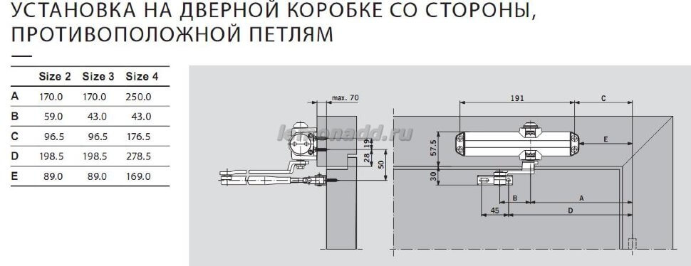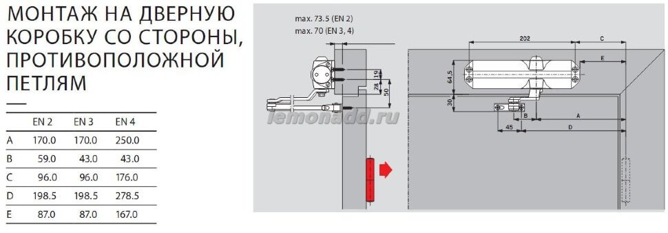 От выбора усилия зависит расстояние от петель до тела доводчика и максимальный угол открытия двери. Для нашей установки мы выбираем усилие EN4.