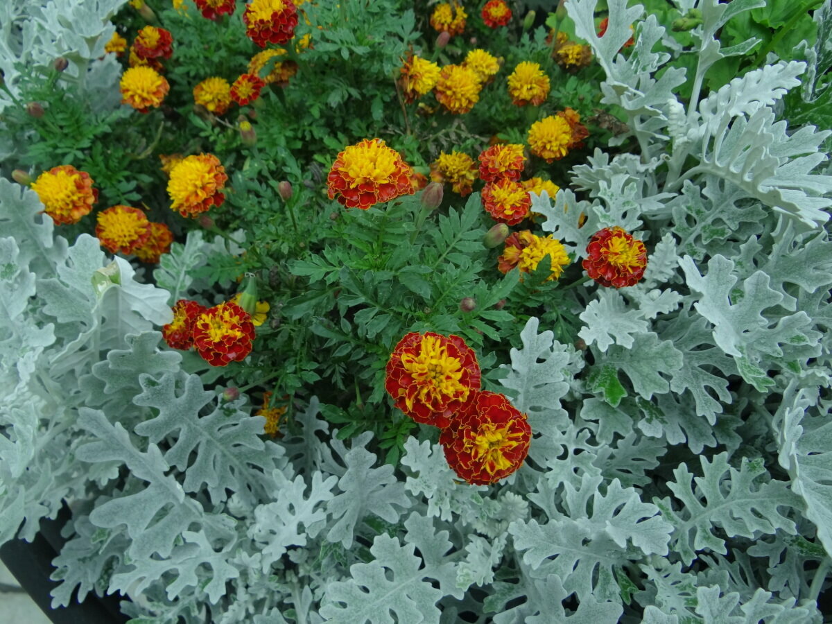 Об одном сорте тагетесов отклоненных, думаю, стоит рассказать. Это весёлый и задорный ‘Арлекин’. Даёт пышный и упругий куст высотой до 50 см с массой ярких цветков разной расцветки. Если прищипнуть его рано, то высота будет до 40 см, но шириной куста до 50 см он удивит.