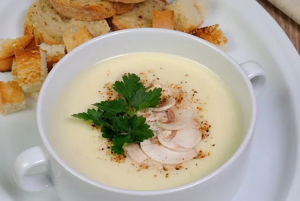 Вот вариант рецепта грибного сыркового супа с гренками.