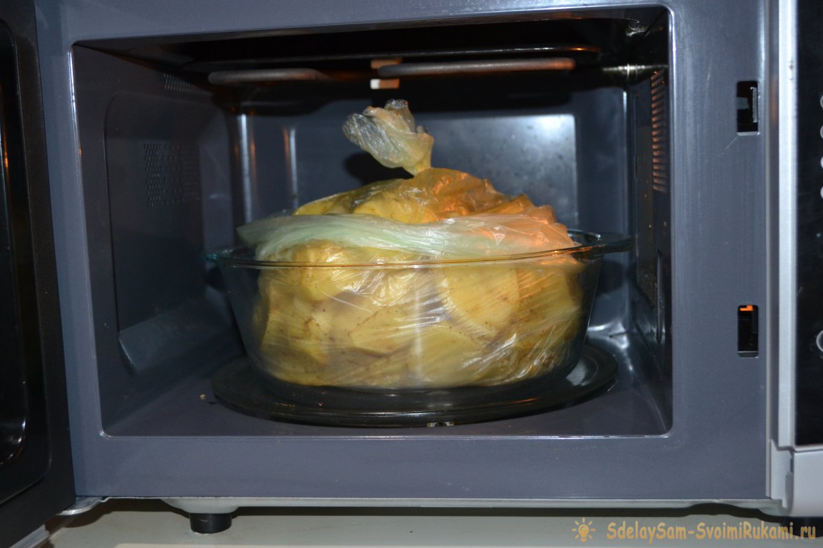 Кроме того, гарнир будет содержать меньше вредного холестерина и больше пользы для организма. Картошечка в СВЧ печи не жарится, а запекается. Кулинарный пакет в процессе готовки наполнится горячим паром, что гарантирует мягкость и сочность блюду.