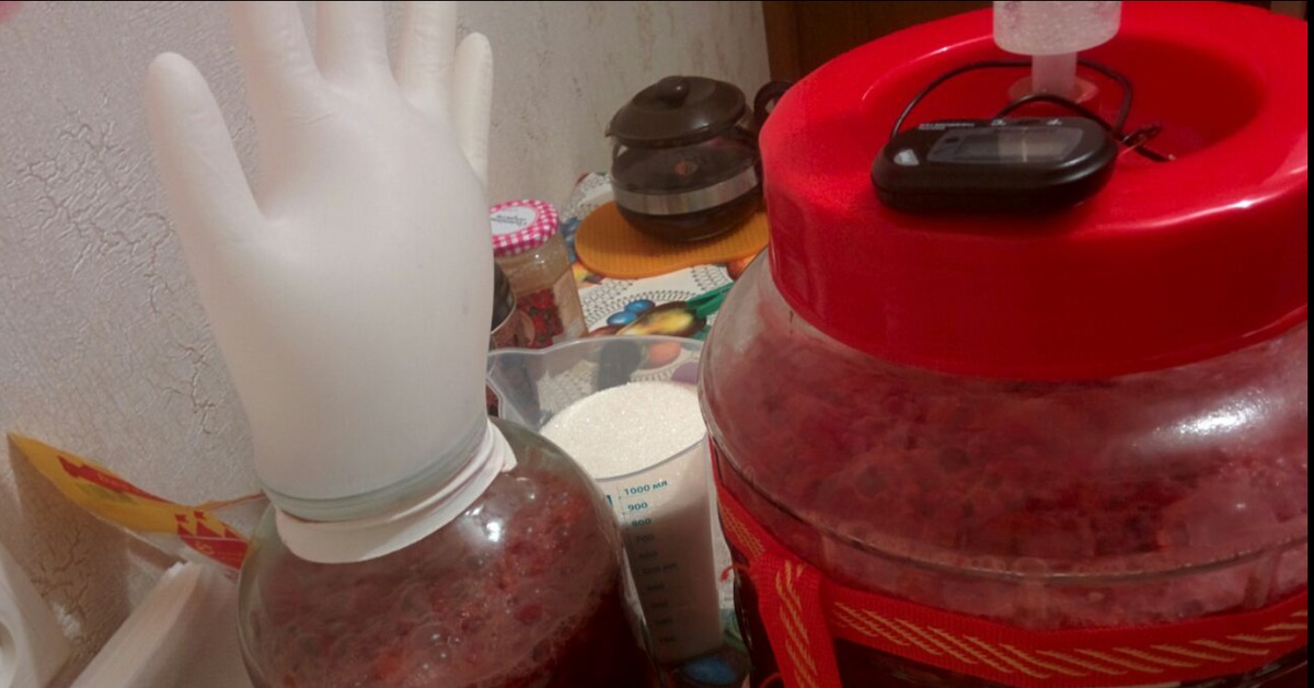 - Переливаем заготовку в стеклянную емкость, надеваем перчатку и отправляем в теплое место на 3-4 недели для брожения.