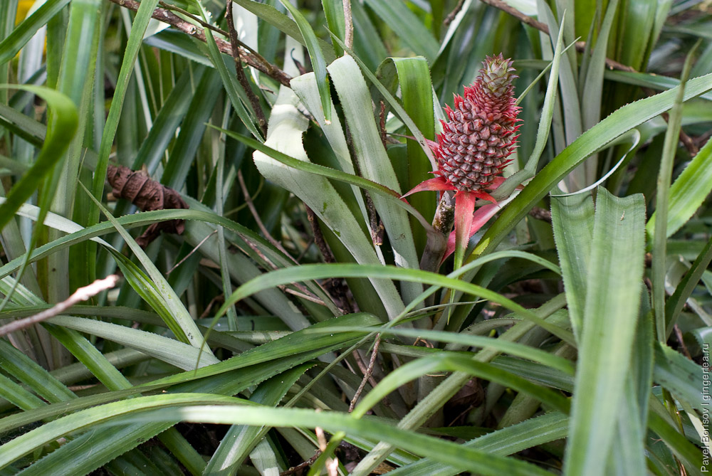 После этого оно выпускает похожее на колосок соцветие, увенчанное множеством цветков (интересно, что хитрые фермеры могут ускорять цветение ананасов, обрабатывая кустики ацетиленом или окуривая поле дымом).