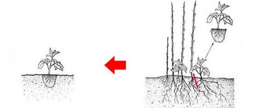 - Извлечение из грунта одревесневших отпрысков. Это однолетние отростки, что находятся на расстоянии 30 см от родительского куста. Длина корней при этом должна быть в пределах 12-15 см.