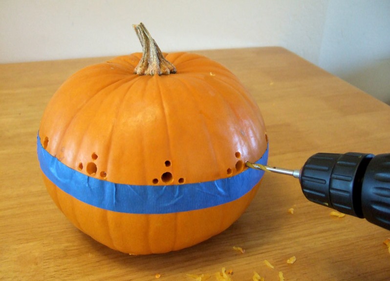 Когда чайник станет чистым и сухим, возьмите фольгу и оберните ею большие части чайника, такие как носик, ручка и ножки, чтобы закрыть большую их часть. Используйте малярную ленту, чтобы заклеить края, ногтем прижмите ленту прямо к краям, где она соприкасается с телом тыквы, чтобы обеспечить тонкую линию.