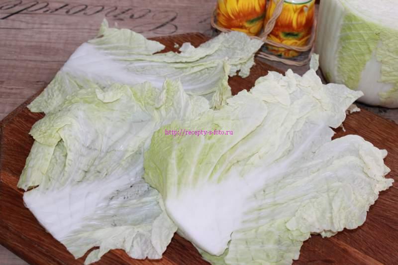 - Доведите до кипения соленую воду.Осторожно очистите от капусты 12 крупных листочков.