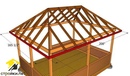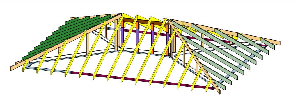 Стропильная система вальмовой крыши предполагает установку четырех накосных стропил – диагональных опорных брусьев, которые идут от двух вершин скатов к верхним углам здания.
