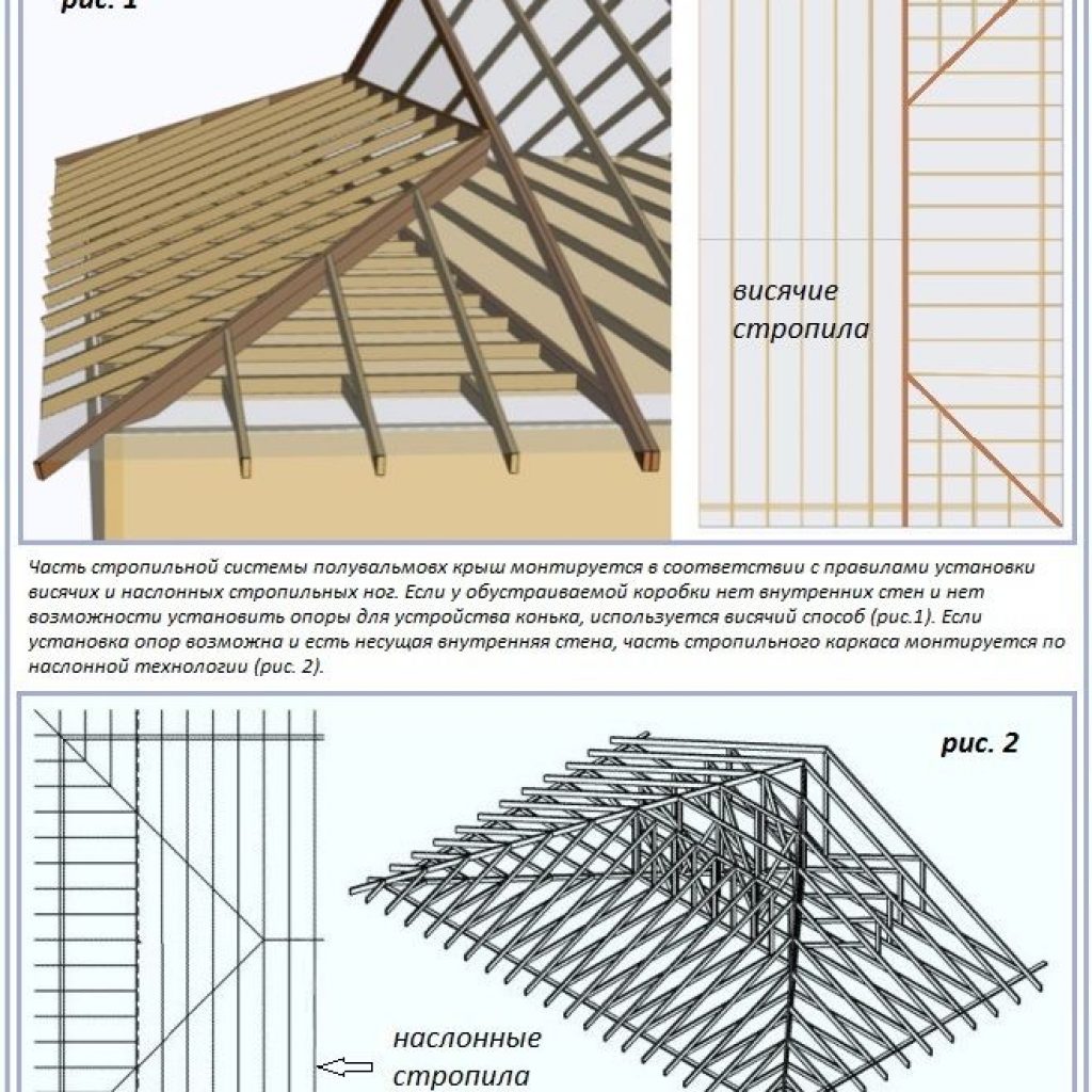 Варианты стропильной системы шатровой крыши. На схеме слева угловое стропило (накос) опирается на шпренгель, аналогичное решение можно использовать для всех типов вальмовых крыш