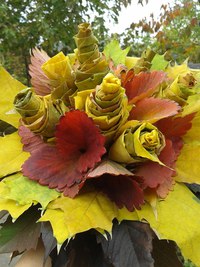 7. Продолжайте повторять этот процесс. Каждый раз находите лист немного большего размера и загибайте его в средней точке. Затем поместите растущую «розу» на место сгиба. Затем загните кончики на каждой стороне внешнего листа и оберните им свою «розу», чтобы получились «лепестки». Обязательно крепко держите все стебли во время движения.8. Когда вы будете довольны своим «цветком», обмотайте стебли цветочной лентой. Затем добавьте веточку и продолжайте заворачивать, чтобы получился более крупный стебель «розы». И все! Кленовые листья создают более плотную розу.