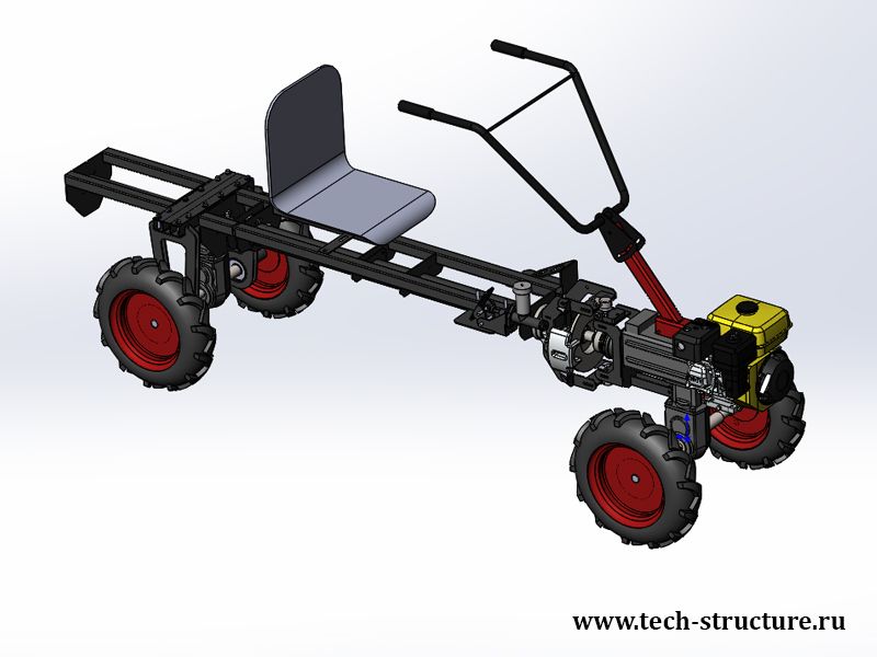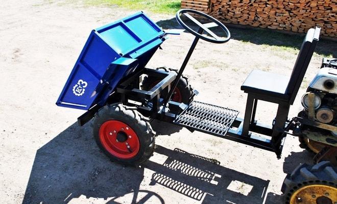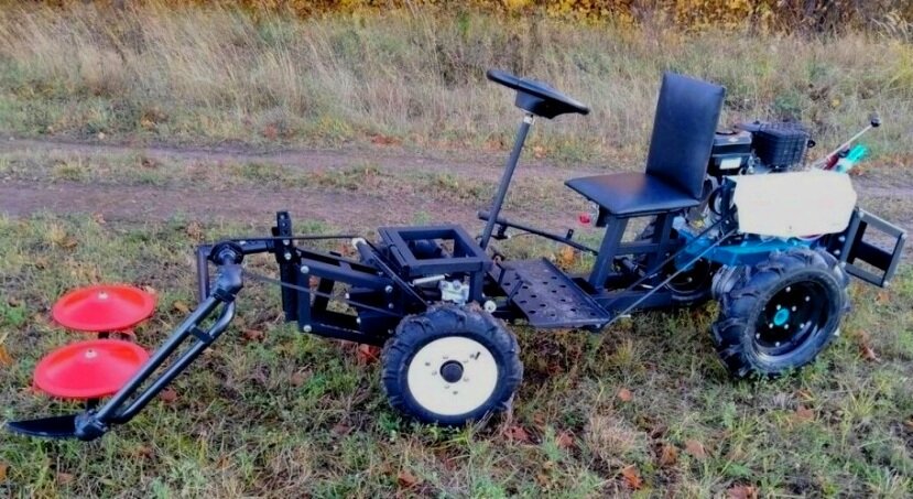 Визуально устройство схоже с телегой, прикрепленной к мотоблоку. Кто-то называет такой аппарат «тракторенком». В состав механизма входят: