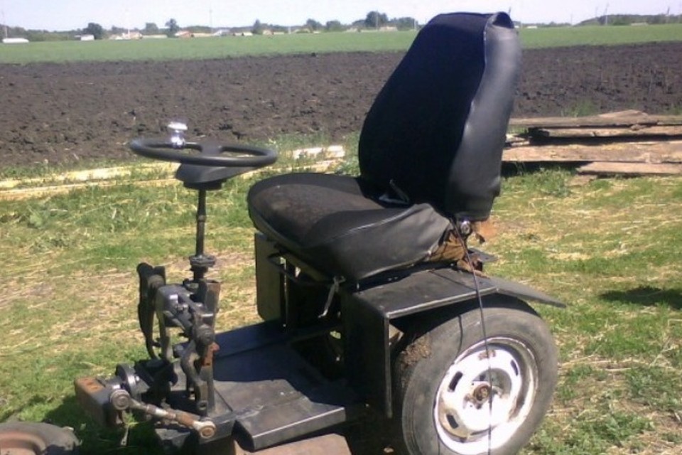 Вторую шестерню устанавливают на рулевую колонку. - Сиденье, которое можно предварительно снять с какого-нибудь легкового автомобиля, нужно приварить к раме салазки. Мастеру необходимо проследить, чтобы оно регулировалось, в особенности при управлении передним адаптером, прикрепленным к мотоблоку.