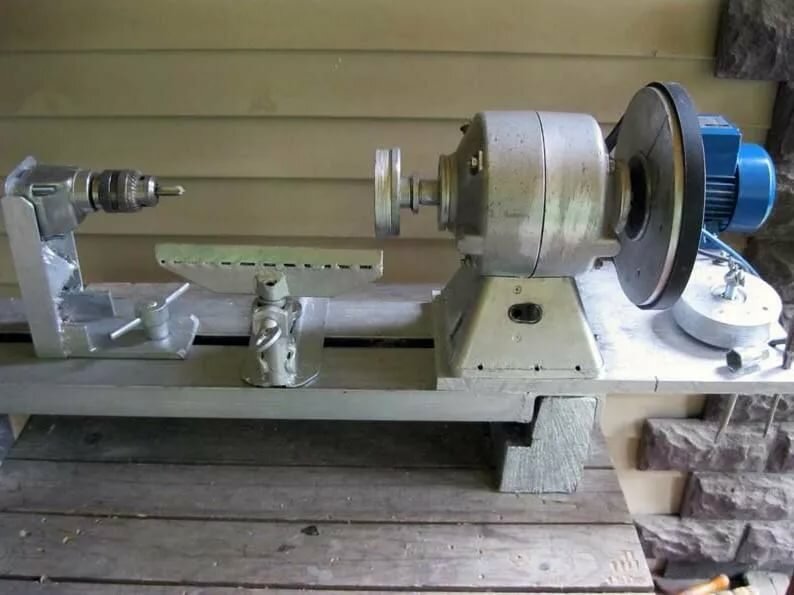Существует множество вариантов изготовления подобного токарного станка, они отличаются сложностью, используемыми материалами. В самом простом случае станок представляет собой доску или кусок толстой фанеры, на одном конце которого установлен упор для дрели с фиксатором, на другом – задняя балка: брусок с валом внутри.