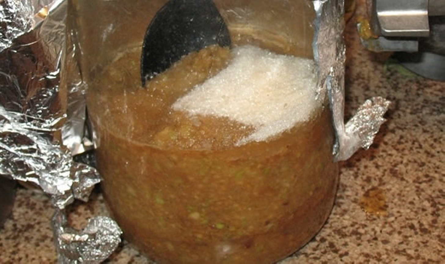В результате на поверхности сока образуется т.н. мезга.На четвертые сутки эту мезгу снимаем. Можно просто столовой ложкой — она хорошо отделяется и снимается. Если емкость позволяет, то лучше снимать мезгу дуршлагом.В результате в банке останется мутноватый яблочный сок ( сусло) с небольшим слоем мезги на поверхности.