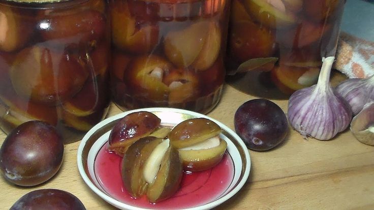 Приготовление: Сливы вымыть. Максимально осторожно изъять косточки, а вместо них внутрь каждой сливы поместить зубчик чеснока. Фаршированные чесноком плоды разложить по заранее подготовленным банкам. Залить маринадом сливы в банках. Оставить на несколько часов, после чего повторить процедуру еще несколько раз.