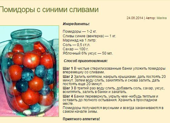 Приготовление: Помидоры и сливы помыть, из слив удалить косточки. Приготовить маринад (вода+сахар+соль+уксус). На дно каждой банки положить нарезанный чеснок, несколько горошин перца, лавровый лист, пару гвоздичек. Плоды вместе с пряностями несколько раз залить кипящим маринадом, а после последней процедуры — закрыть и поместить в место хранения.