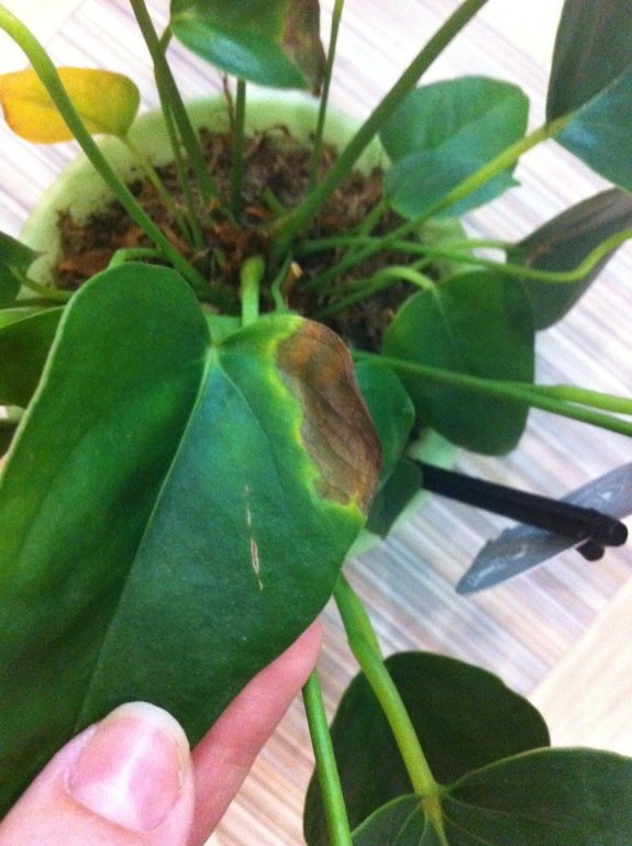 Листья антуриума становятся коричневыми из-за слишком большого количества прямых солнечных лучей и низкой влажности .