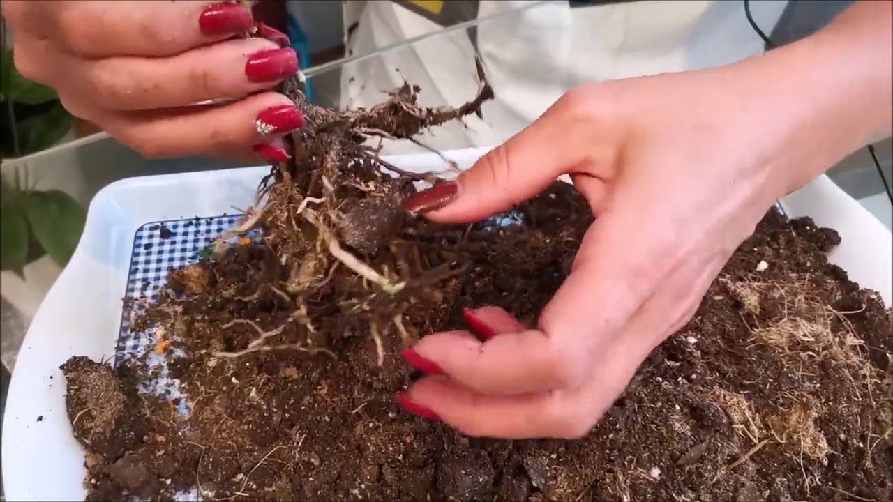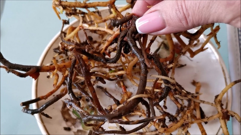 - Осмотрите корни на предмет гнили. Отрежьте гниющую часть, срез обработайте толчёным активированным углём.