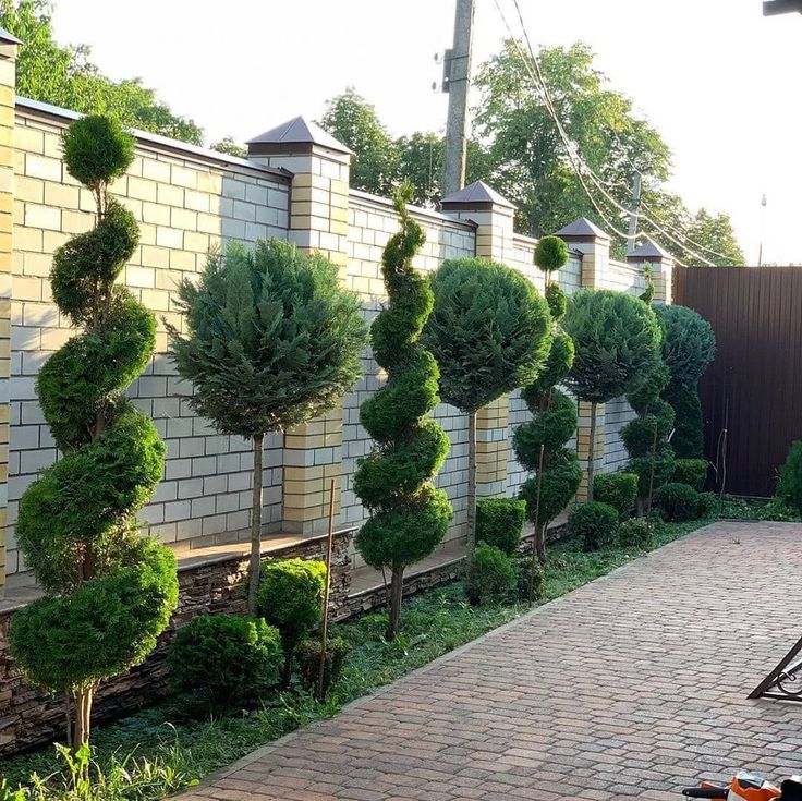 Хорошо смотрятся туи, высаженные в ряд вдоль забора, тропинки.