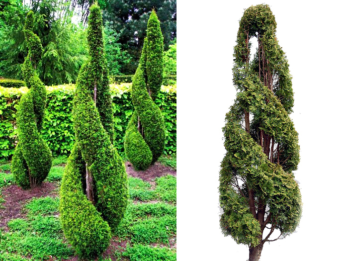 Садовники обрезают крону, боковые ветки, немного ограничивая их рост. Из туи можно создавать удивительные садовые скульптуры животных, сказочных персонажей, геометрические фигуры, целые композиции.