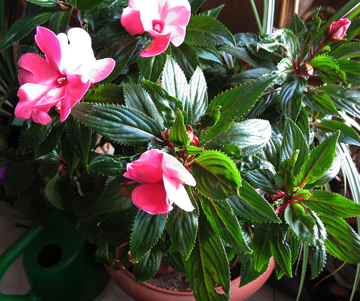 Продолжительное время цветущая Недотрога, выведенная на основе новогвинейского бальзамина. У этого растения яркие, экзотического вида цветочки распускаются на фоне блестящих зеленоватых или бронзовых листиков.