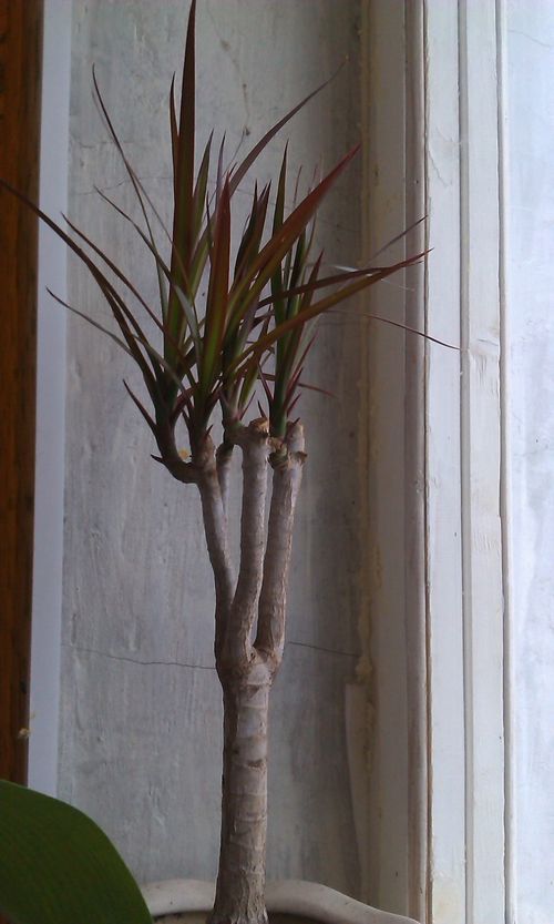 - Окаймленная (Маргината) с жесткими узкими листьями быстро растет, ее приходится регулярно подрезать. В противном случае, похожая на пальму макушка через несколько лет упрется в потолок, а тонкий коленчатый ствол станет кривым. Без обрезки вырастить много верхушек не получится. Даже если на 2 или 3-метровом цветке случайно просыпаются боковые спящие почки, достигнув 1-3 см они обычно усыхают естественным образом.