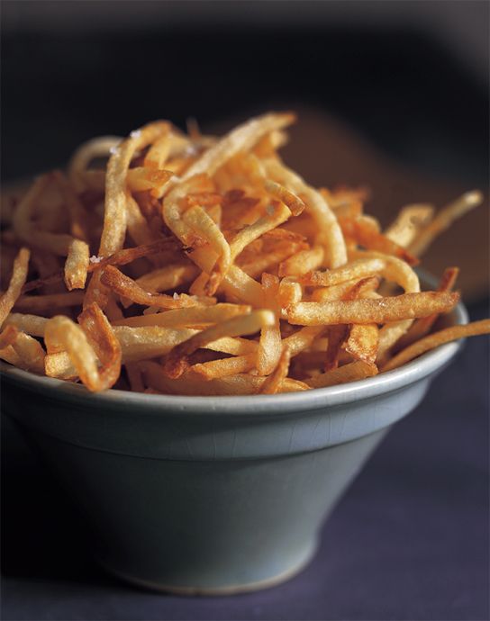 Приготовьте рассол , используя комбинацию холодной воды, кукурузного сиропа, соли и белого уксуса. Нарежьте картофель нитками толщиной менее 1/2 дюйма. Опустите в рассол. Накройте и поставьте в холодильник на 2 часа или на ночь. Слить воду, дважды подняться в холодной воде, затем промокнуть их полностью сухой.Обжаривайте партиями при 300°F в течение примерно 5 минут. Выньте и отложите на бумажное полотенце.