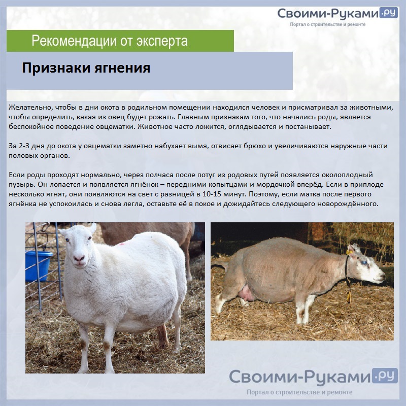 Самка может выбрать стоячую позу, а потому надо убрать все лишние предметы и обеспечить мягкость пола, чтобы не травмировать ягненка. Если у овцы многоплодная беременность, то надо отсчитывать интервал между родами: обычно это 20-45 минут. По завершении родов надо проверить, полностью ли вышла плацента, чтобы избежать инфекции и развития заболеваний. Если знать, как правильно помогать самке при родах, то даже начинающий фермер с помощью ветеринара справится с этой задачей.