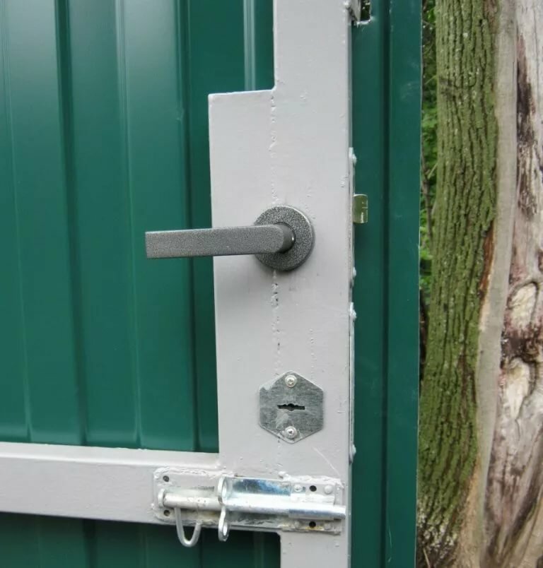 В этом случае вору сложно подобраться к защелке, чтобы спилить либо сдвинуть ее. Как правило, для калиток из профлиста используют врезные конструкции. Они помогают надежно защитить дачу от злоумышленников.