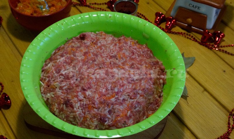 В большую миску положите свиной фарш, вареный рис, взбитые яйца, перец, майоран, приготовленный лук и чеснок, соль и несколько крупок черного перца.Смешайте чистыми руками или деревянной ложкой до однородного состояния.