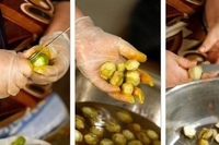 Маринование грецких орехов : Залейте кипятком большую кастрюлю и добавьте грецкие орехи. Варить 15 минут.