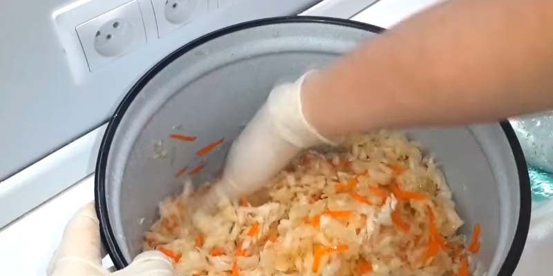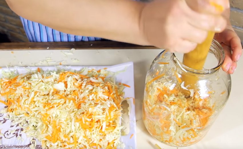 Слишком усердно мять капусту не надо. Как только появится капустный сок, а капустная шинковка потеряет свой первоначальный вид – массу можно укладывать в подготовленную тару.