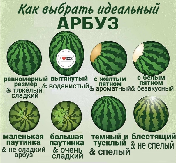 Если же оно не имеет яркого оттенка, то значит плод будет не очень вкусным.По размеру и весуОчень большие арбузы (более 10 кг) лучше не покупать, потому что велик риск, что они будут недозрелыми или выращенными с использованием химикатов. Самые сочные плоды обычно имеют размер немного больше среднего (от 5 до 10 кг), но это отчасти зависит от сорта и региона произрастания. Обычно мякоть у спелого плода имеет более низкую плотность, поэтому он будет весить меньше. Если положить в воду зрелый арбуз, то он не утонет, в отличие от неспелого. Когда плод слишком легкий для своего размера, значит, он перезрел и потерял много влаги.По сетке от опыления пчеламиУ хорошего арбуза на кожуре должна быть сетка от опыления, которая немного напоминает шрам, но опасаться ее не стоит. Это значит, что пчелы часто «навещали» завязь, и такой плод будет сладким.По формеАрбузы бывают овальными или круглыми. Считается, что лучше покупать круглые плоды, потому что они будут более сладкими, а те, что вытянутой формы — более водянистые, однако многое зависит от сорта.