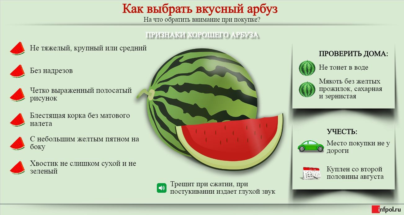 При этом, если человек садится на арбузную монодиету, то это может быть опасно для здоровья. Лучше устроить разгрузочный день, в который допустимо употреблять до 3 килограмм ягоды. Разрешенная суточная норма арбуза для детей — от 80 грамм до 150 грамм мякоти.Сезон арбузов в РоссииСамые сладкие и сочные арбузы поспевают в конце июля и начале августа, поэтому как раз в конце лета начинается сезон продажи этих ягод. Их можно встретить и ранее, например, в начале июля, однако есть риск приобрести несозревший и невкусный плод. В начале августа на прилавках появляются отечественные арбузы, а до этого их обычно привозят из-за границы.Где покупать арбузыЕсли арбуз продается на рынке, то у продавца обязательно должны быть соответствующие сертификаты о качестве ягод и медкнижка. Хорошо, если после приобретения плода выдается чек, потому что с ним можно будет обратиться к продавцу с жалобой, если арбуз попался испорченный. Нельзя брать продукт в необорудованных точках, возле дорог, потому что он может быть опасен для здоровья, а у продавцов нет условий для личной гигиены.