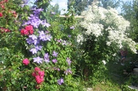 - Сорт «Лонг Файер»с огромными, до 15 см, цветочками малинового цвета украшает лиану, вырастающую до 1,7 м. За сезон цветёт один раз. Но, цветение настолько пышное, что из-за цветков практически не видно листьев.