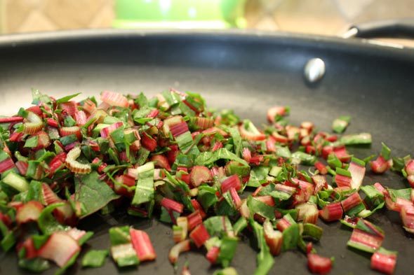 Для приготовления начинки 0,5 кг мангольда бланшируют 2 минуты в кипятке, дают стечь лишней жидкости. Шинкуют 2 головки красного лука, обжаривают в сковороде на подсолнечном масле, добавляют туда же 3 зубчика рубленного чеснока, мангольд, белое вино — треть стакана, тушат до готовности, присаливая и поперчив. Тесто раскатывают, смазывают сковороду подсолнечным маслом, выкладывают туда пласт, плотно прижимают и накалывают часто вилкой. Выпекают в течение 10 минут в духовке при температуре 225°C. Пока тесто запекается, подготавливают заливку, взбивая 3 яйца, 200 мл сливок, мускатный орех — щепотку, немного красного и черного перца. Лучше использовать блендер. В основу для пирога выкладывают тушеные овощи, затем — кусочки мягкого сыра фета (150 г), 80 г толченого грецкого ореха, а сверху поливают смесью яиц и сливок. Пирог выпекают в заранее нагретой духовке в течение получаса. Из формы достают, когда остыл.