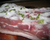 - Дно эмалированной или керамической кастрюлю посыпать солью, выложить оставшиеся специи, уложить шпик.