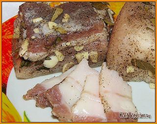 - Шпик порезать кусочками, натереть смесью давленого чеснока, размолотого перца и соли.
