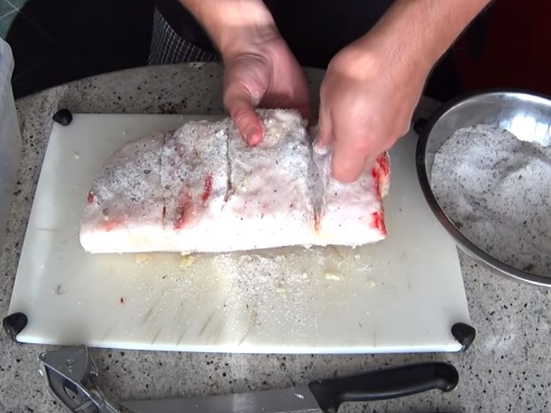 - Большой кусок сала необходимо разрезать надвое. Если пренебречь этим советом, то сало может плохо просолиться.