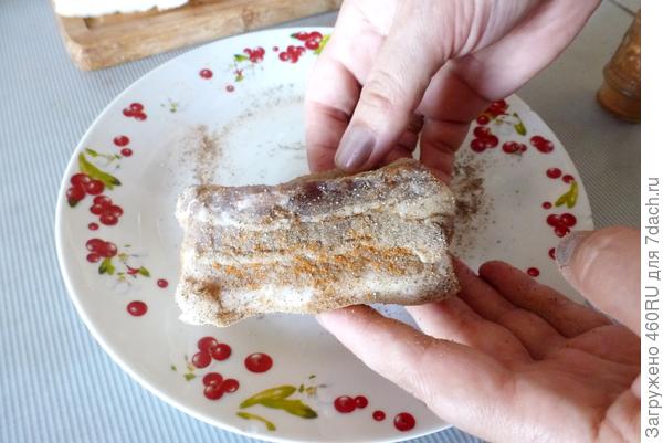 Теперь каждый кусочек обсыплем черным и красным перцем. Можно сделать микс специй, взять, например, перец, паприку, сухой чеснок, лавровый лист и др. Это по вкусу.
