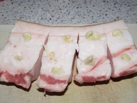 шаг 8Спустя указанное количество времени сало вынимаем из холодильника, достаем его из пиалы, очищаем от чеснока и соли. Нарезаем каждый кусочек довольно тонкими ломтиками.
